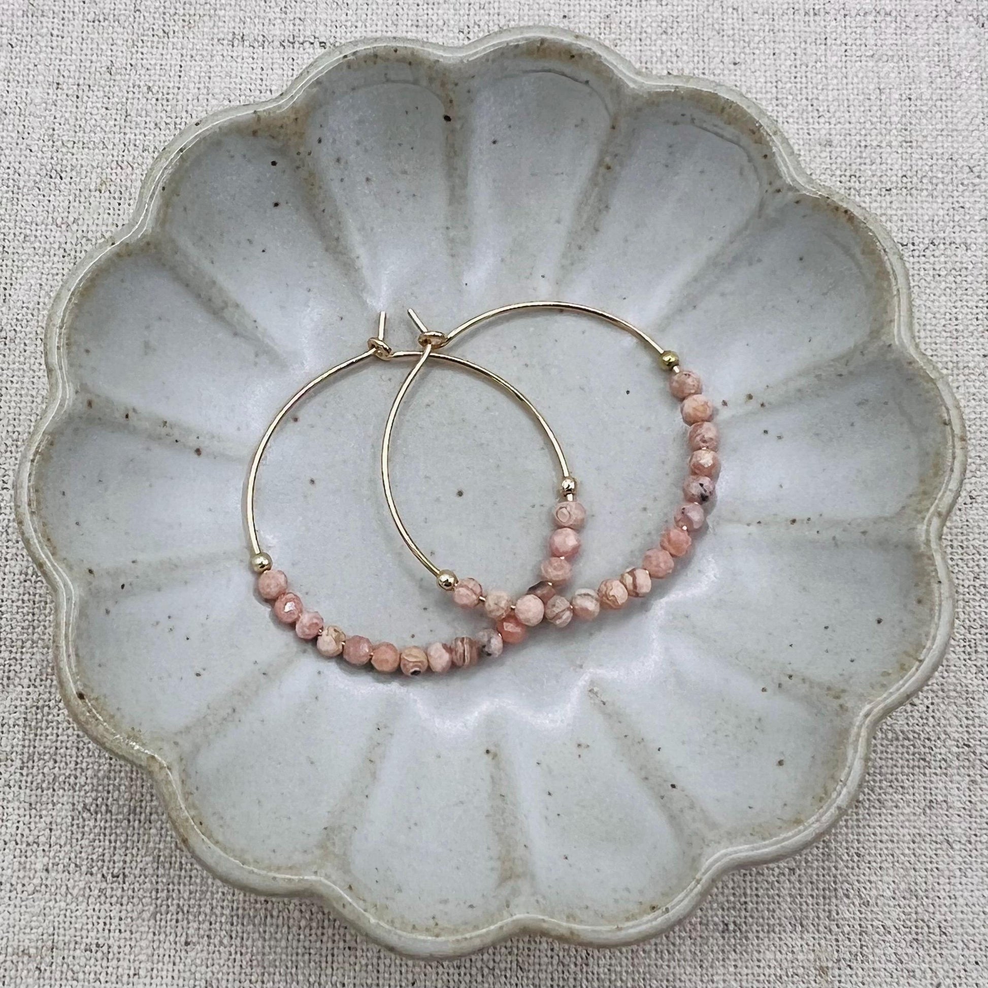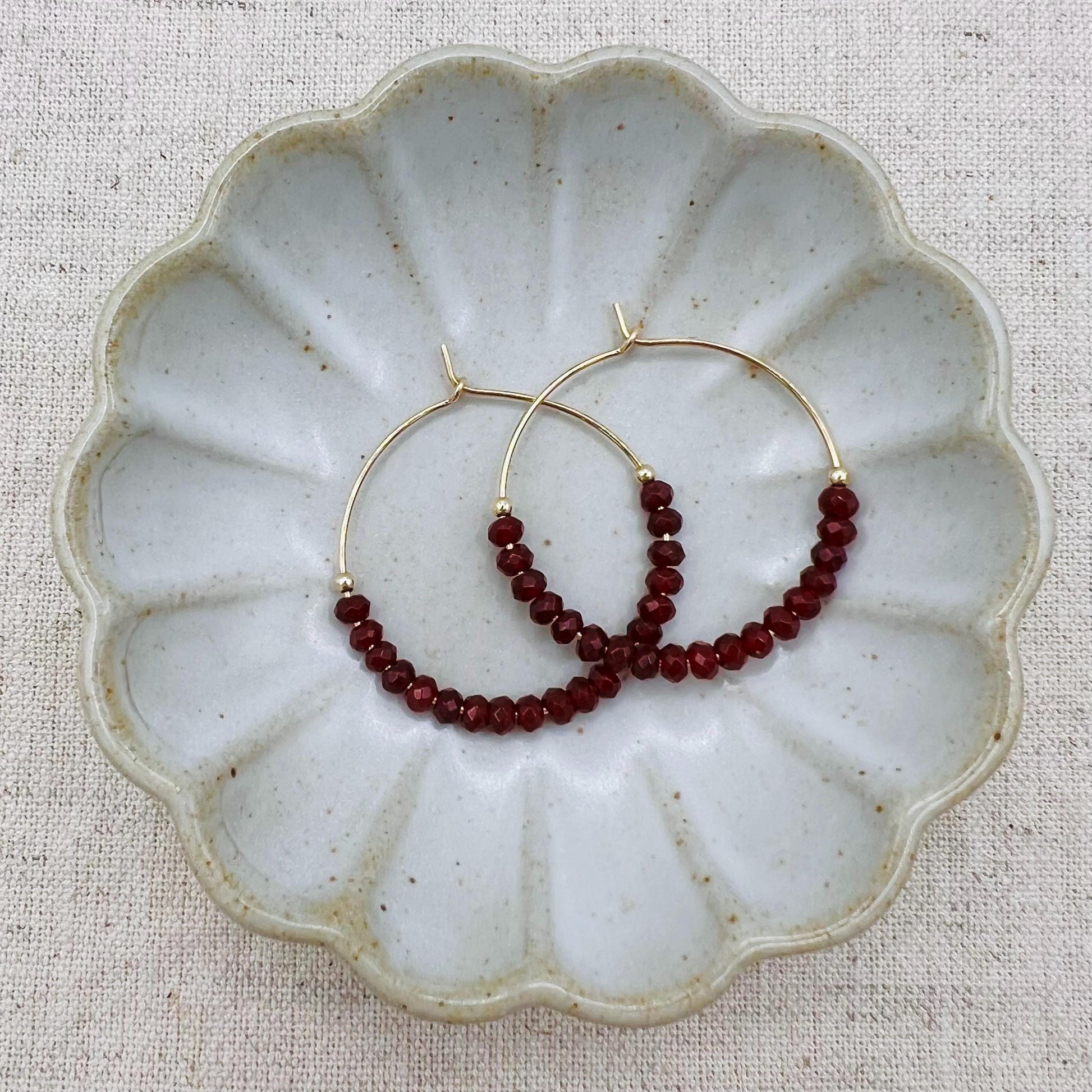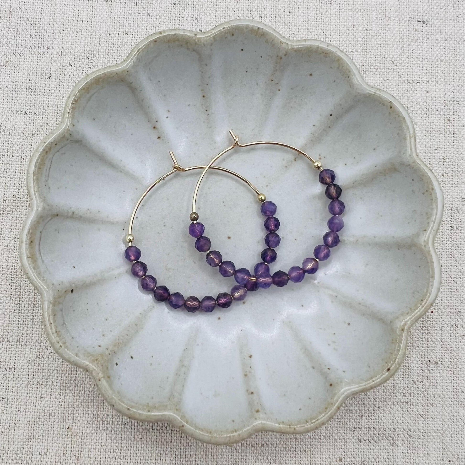 These earrings are handcrafted with 30mm 14k gold filled hoops and multi-faceted gemstones. They are sweat-proof, waterproof and tarnish resistant.