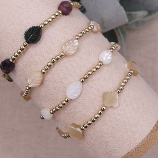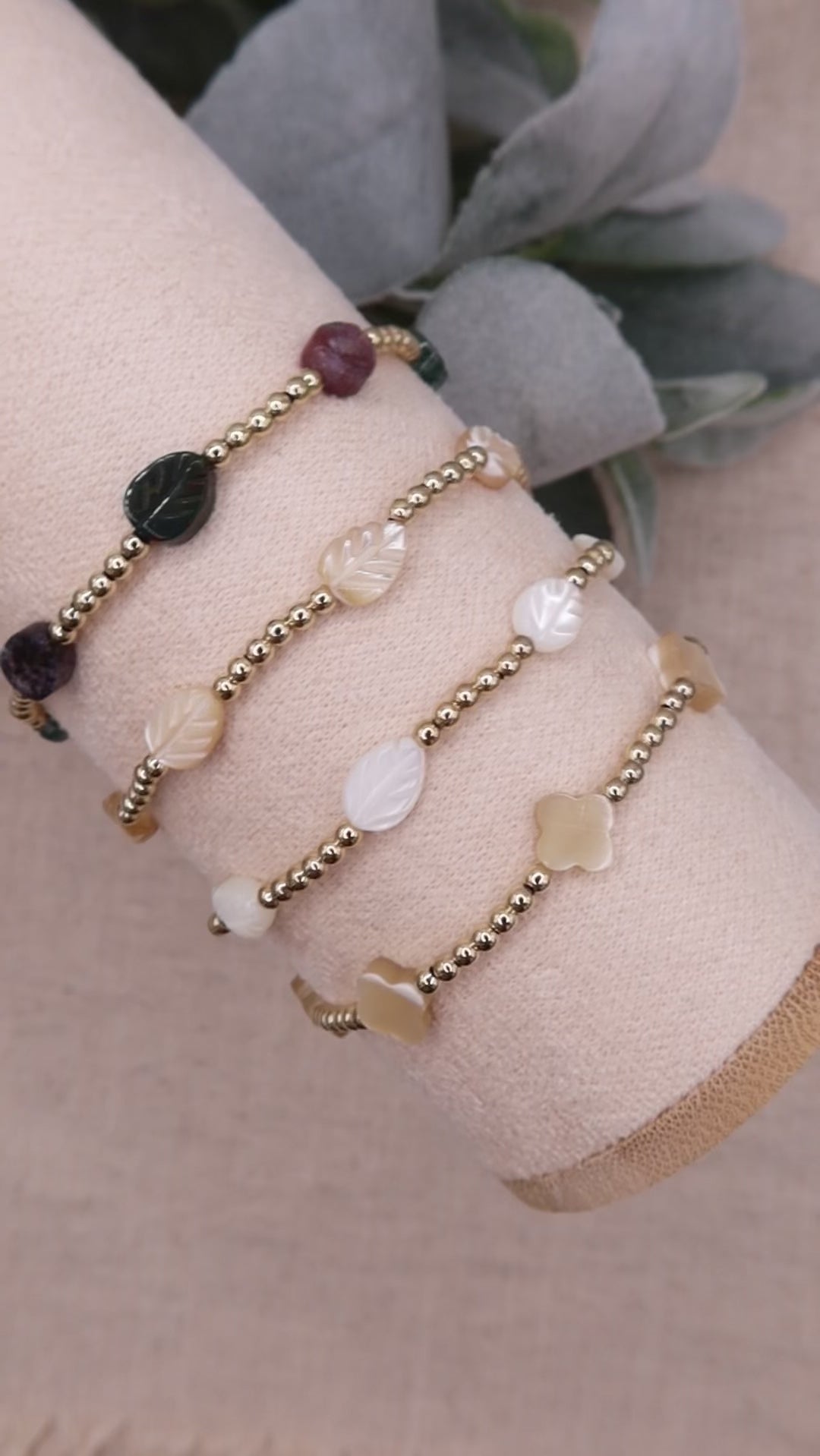 These bracelets capture the cozy beauty of crisp days, falling leaves, and autumn’s gentle light. Featuring agate gemstones, mother of pearl, and 14k gold-filled beads. Perfect for layering or wearing on its own, they are a timeless reminder of the season’s simple comforts. Our gold-filled jewelry is waterproof, sweat proof and tarnish resistant.