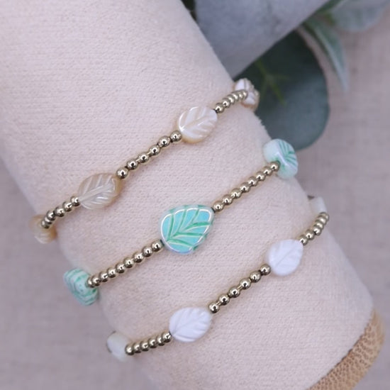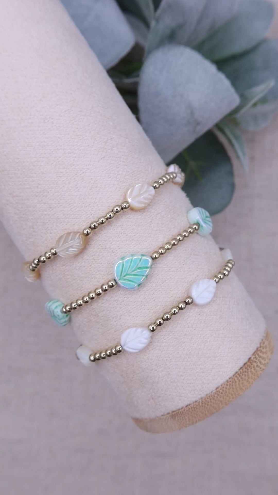 These bracelets capture the cozy beauty of crisp days, falling leaves, and autumn’s gentle light. Featuring mother of pearl, Czech glass, and 14k gold-filled beads. Perfect for layering or wearing on its own, they are a timeless reminder of the season’s simple comforts. Our gold-filled jewelry is waterproof, sweat proof and tarnish resistant. You will receive ONE OF EACH bracelet in this trio including: (1) white pearl leaves bracelet, (1) Czech glass turquoise leaves bracelet, and (1) golden pearl leaves bracelet.