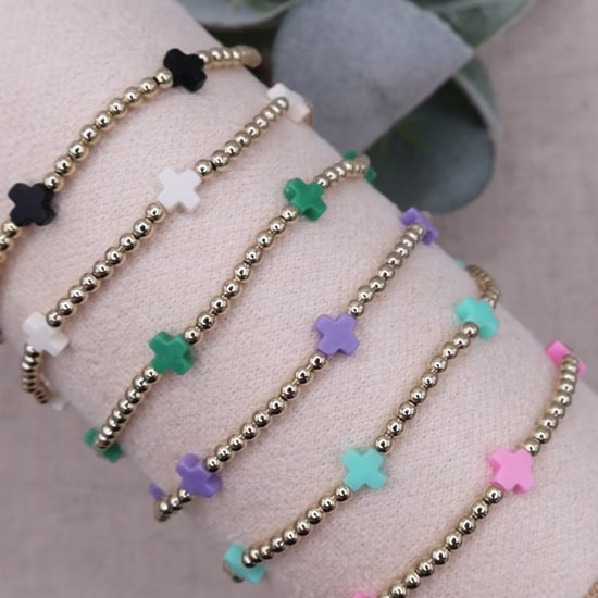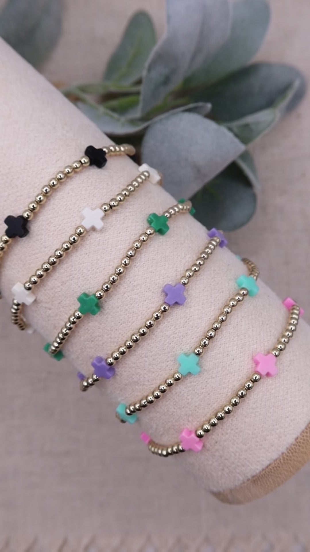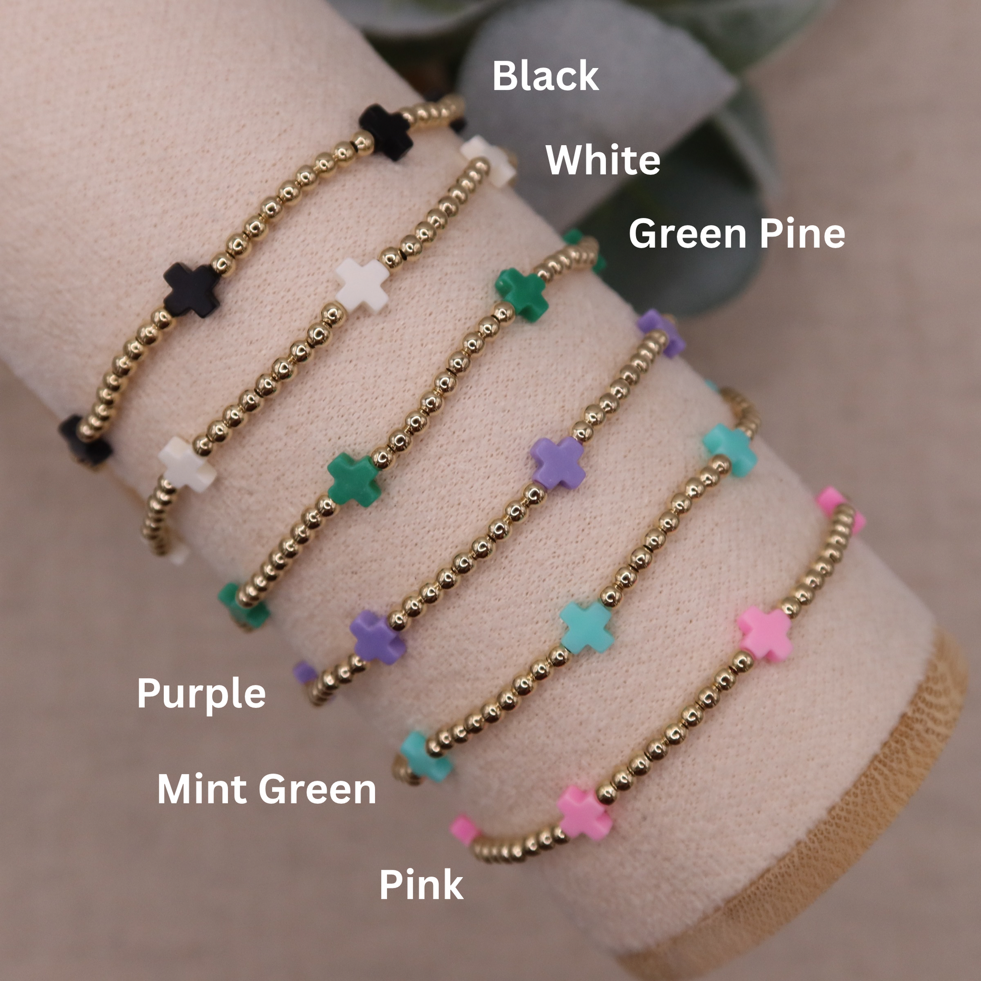 A beautiful and dainty bracelet with tiny crosses throughout, a beautiful reminder of your faith. Each bracelet is handcrafted with 14k gold-filled beads and tiny cross beads made of coral. Our gold-filled jewelry is waterproof, sweat proof, and tarnish resistant. You will receive one bracelet in your choice of color.