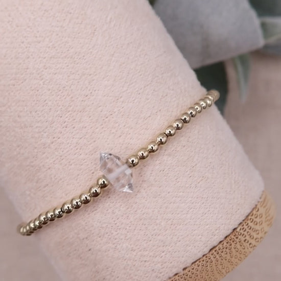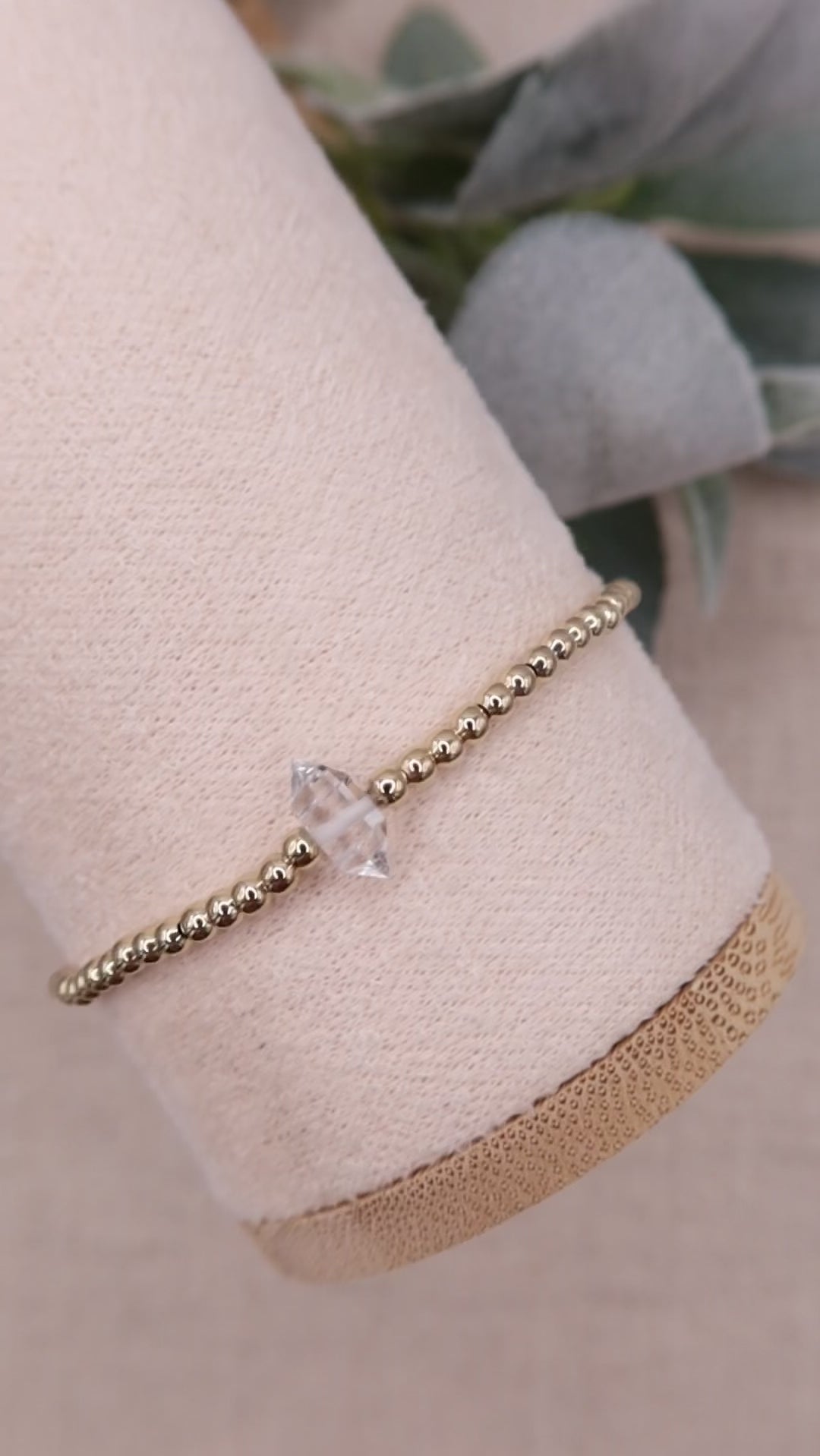 Herkimer diamonds are a rare, exceptionally clear, double-terminated variety of quartz crystal. Each bracelet is handcrafted with 14k gold-filled beads and one Herkimer diamond. Our gold-filled jewelry is waterproof, sweat proof, and tarnish-resistant.