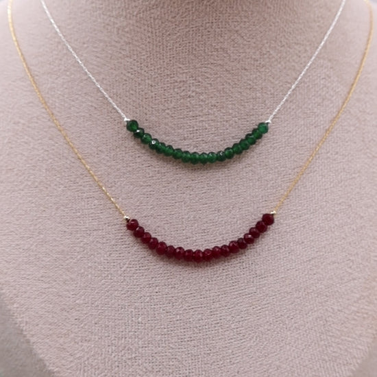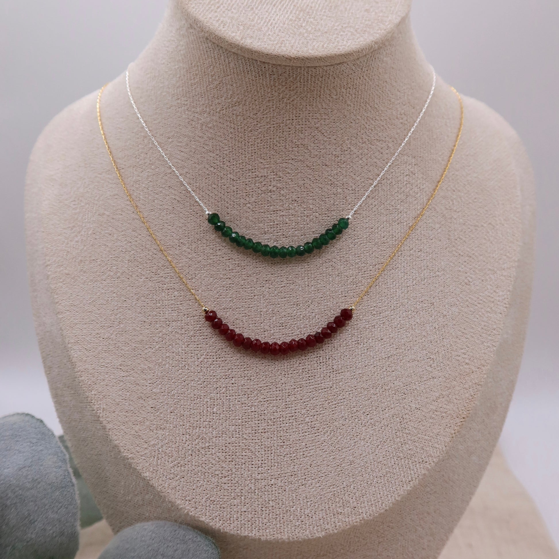 This necklace is sure to sparkle at your holiday event! Made with your choice of Sterling Silver or 14k Gold-filled chain, and either Ruby Red or Emerald Green multi-faceted Jade.
