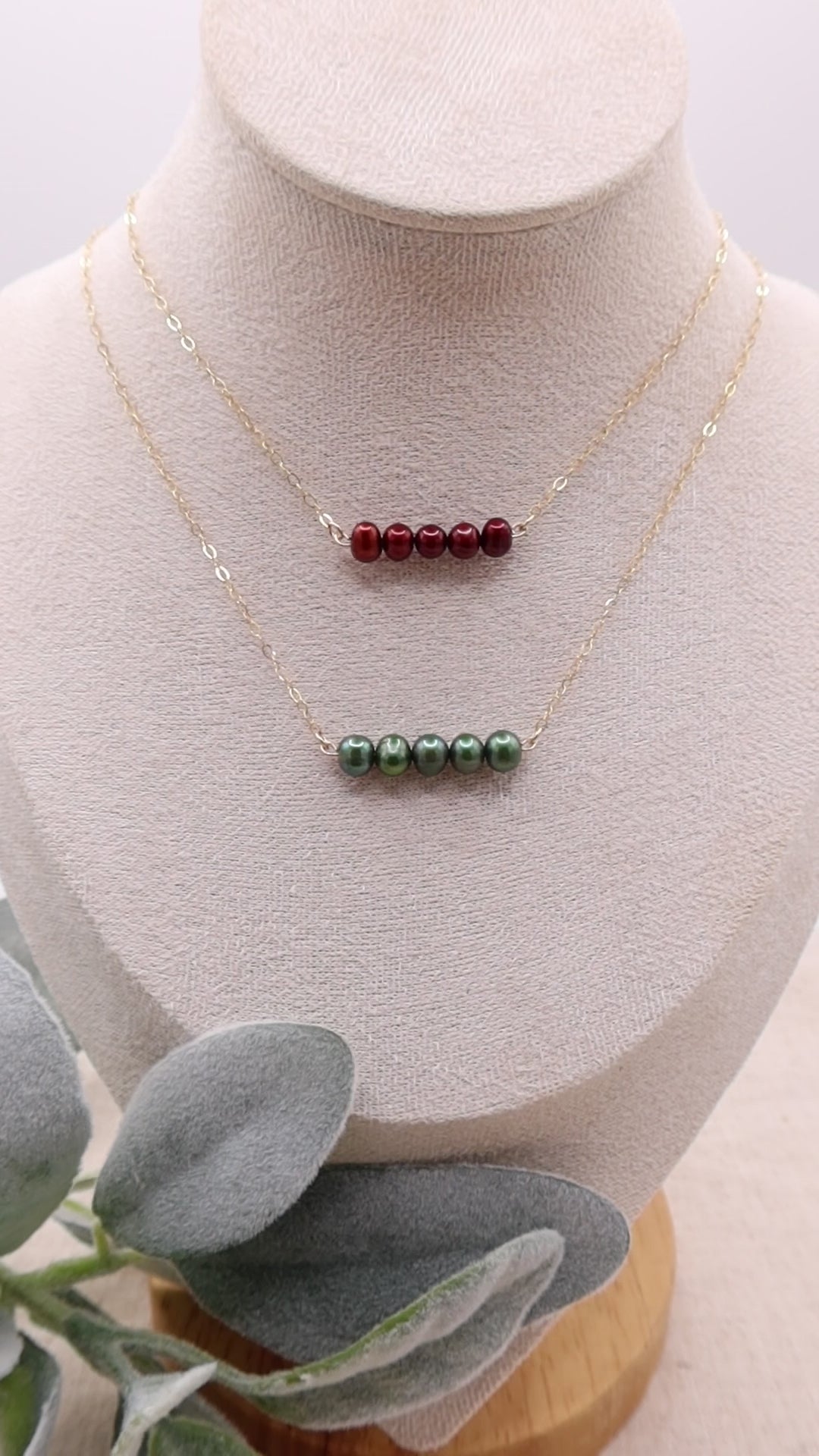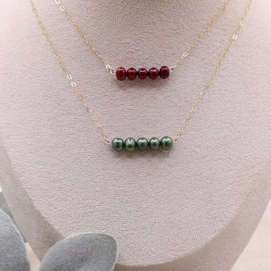 These pearl necklaces are absolutely stunning and will elevate your look. They are perfect for your holiday party! Each necklace is handcrafted using 14k Gold-filled chain and Freshwater Pearls, choose from Burgundy Red or Olive Green. Our gold-filled jewelry is waterproof, sweat proof and tarnish resistant.